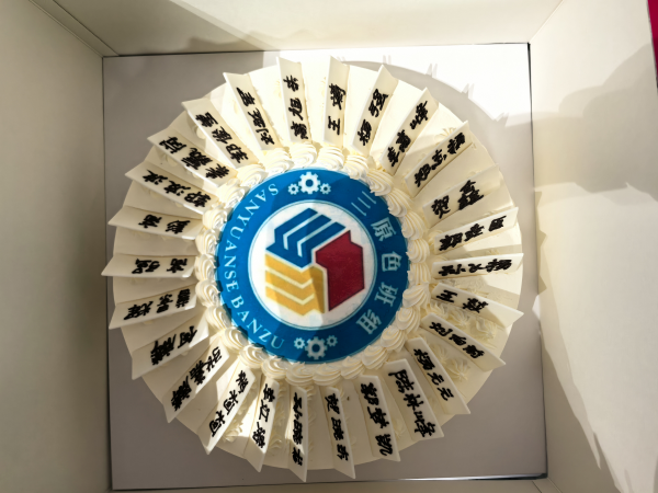 學習結束后,就進入了第二個班組活動——回顧往昔,慶祝“三原色”三歲生日。磨工班組的成員們齊聲喊出“磨工班組三歲啦!”,有人趕忙去拿蛋糕,有人忙著搬桌子,還有人拆蛋糕包裝。組員彭高和高強小心翼翼地拿著蛋糕轉來轉去,認真找著合適的角度,想把這開心的一刻拍下來留作紀念。作為這個大家庭的一員,每個人都在用心為這場慶?;顒映隽?,充分展現(xiàn)出團隊的凝聚力 。